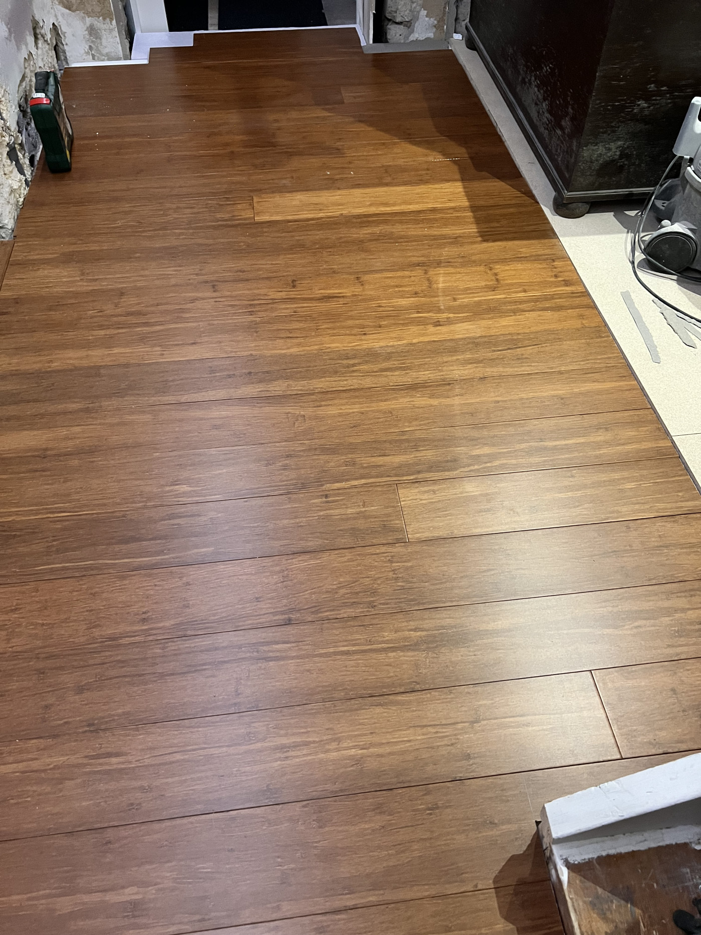 Mer av bambugolvet är på plats! Utrymmet som ska bli förråd har istället fått golvspån.