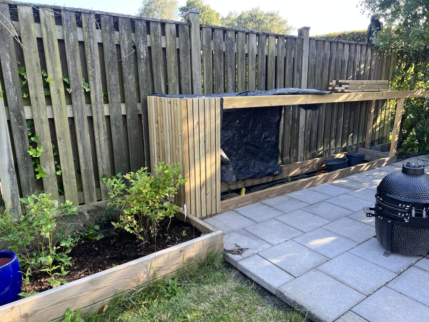 Igår fick det bli början av inklädnad, nästa sektion blir en dörr så nu ska jag fundera över hur jag ska göra med dörrarna. Går på samma stil med tryckt virke som återfinns i hela trädgården, denna gången ribbor med lite mellanrum och svart plast bakom. Blev ändå ganska bra tycker jag.