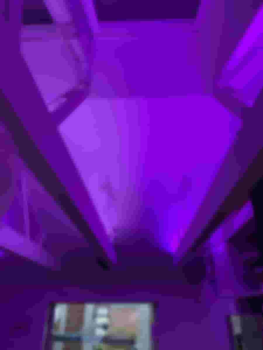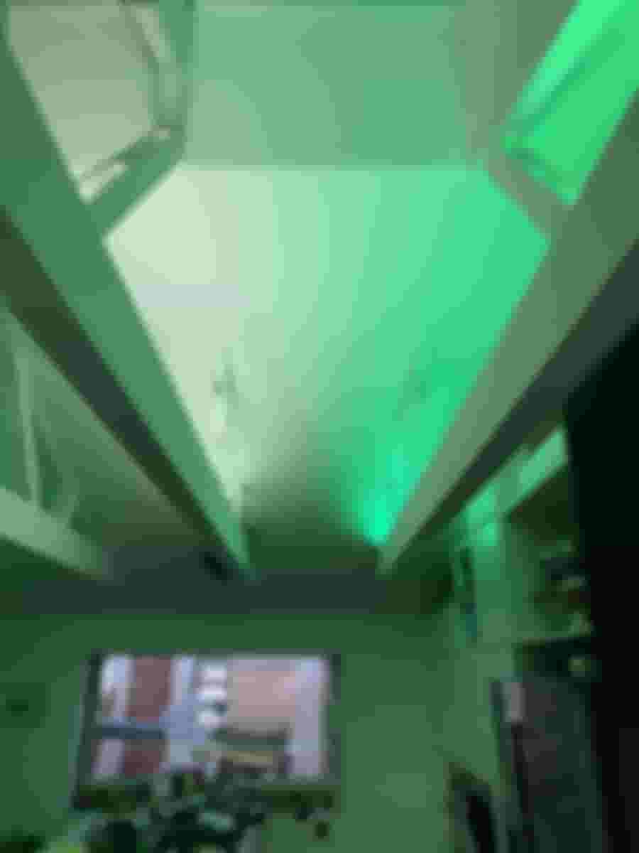 Det är några år sedan som vardagsrummet och köket blev ”klart”, och i en av takstolarna installerades en proof-of-concept för belysningen. Tanken var att köra med individuellt adresserbara LED-slingor, där man kan styra både RGB och ljusstyrka på varje individuell LED.