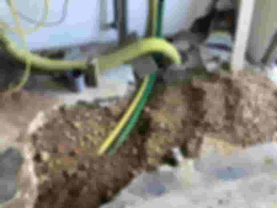 Inne i garaget stötte vi på ett betongrör som om vi uttrycker det snällt, var lite i vägen. Vi hade en misstanke om att det var där den gamla inkommande elen gick och ett litet hål bekräftade detta. Elen är alltså uppgrävd och ersatt ute i trädgården, så detta används inte alls längre.