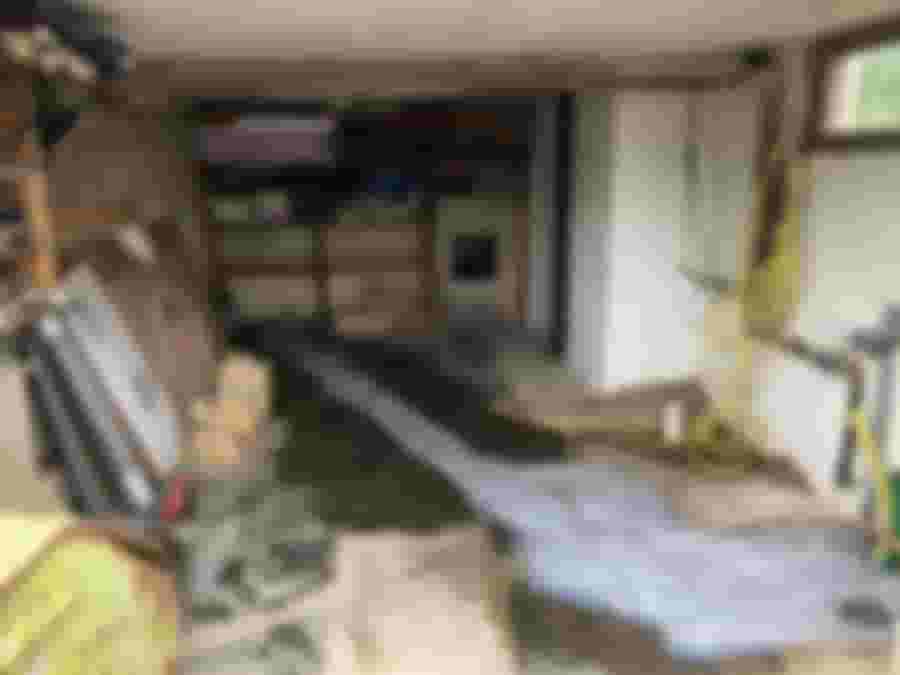 Öppen dörr till en renoveringsplats med synliga byggmaterial och verktyg. En oorganiserad arbetsyta med förvaringshyllor i bakgrunden.