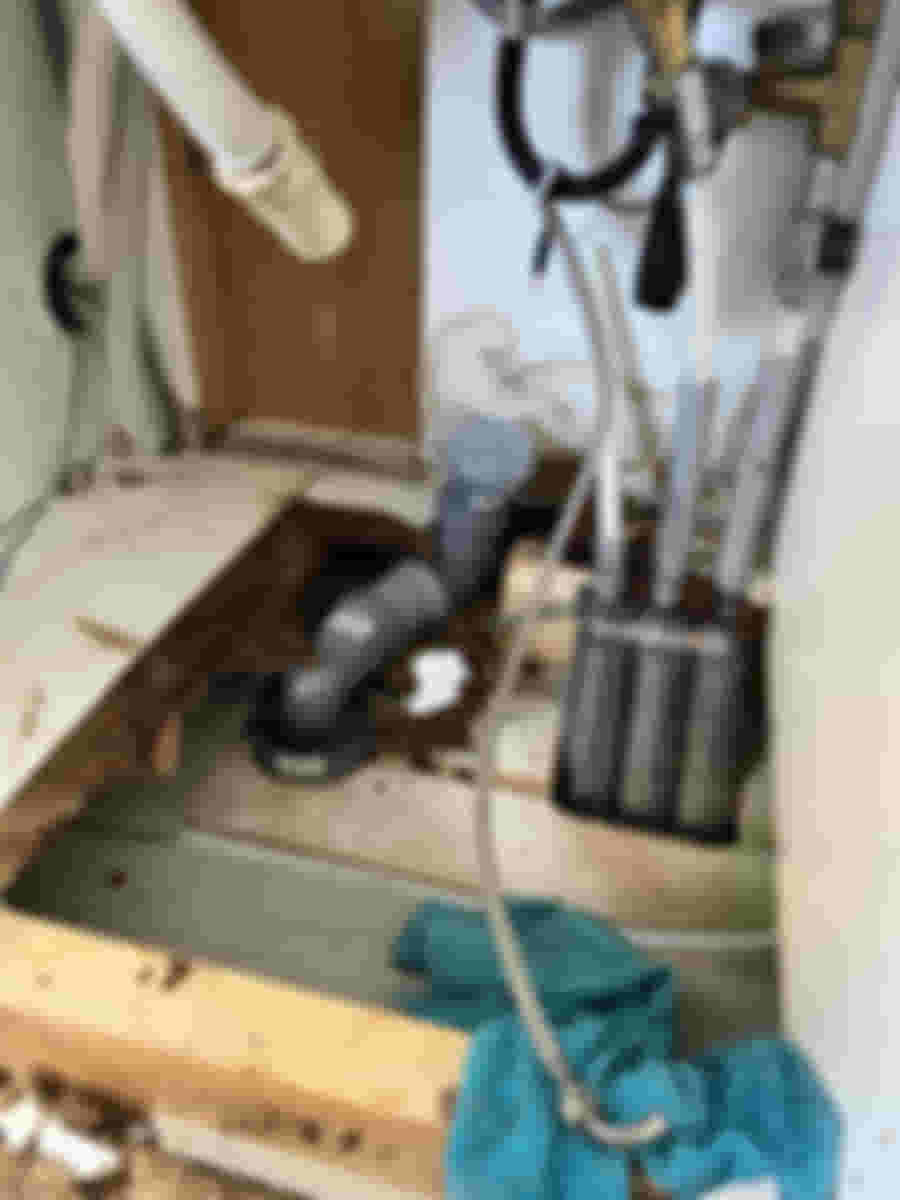 Mest troligen har det läckt enbart lite, lite vatten, och det har fångats upp av spånskivan snarare än att det har runnit ner under skåpet. Rensat ut det dåliga och nu har det stått öppet några dagar i väntan på några delar till vattenlåset, men i det stora hela, inte så farligt som jag befarade.